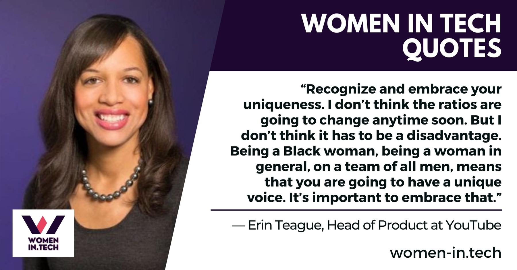 “Recognize and embrace your uniqueness. I don’t think the ratios are going to change anytime soon. But I don’t think it has to be a disadvantage. Being a Black woman, being a woman in general, on a team of all men, means that you are going to have a unique voice. It’s important to embrace that.”